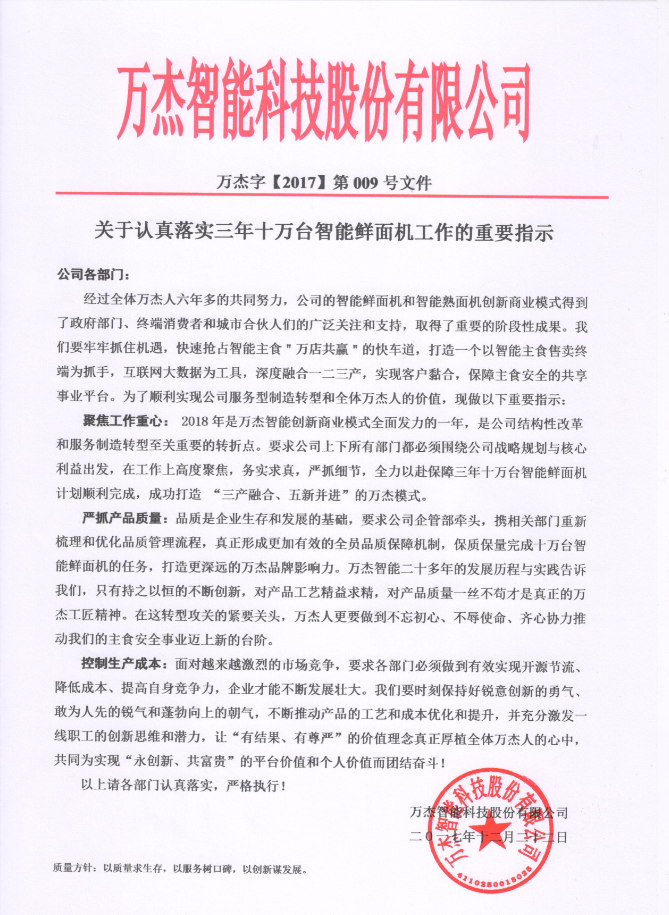 關于認真落實三年十萬臺智能鮮面機工作的重要指示