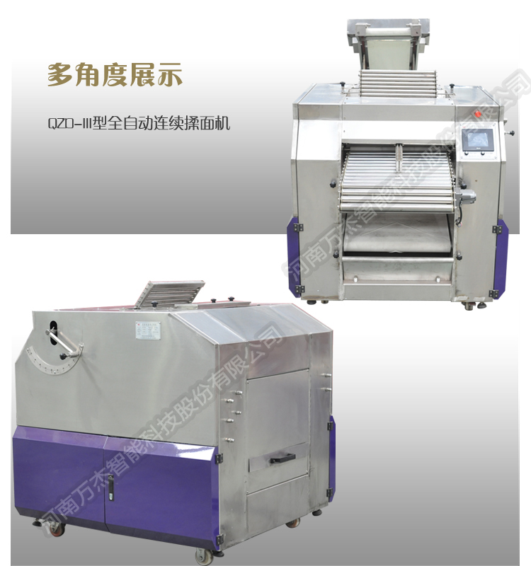 本產品為手動/自動兩用連續壓面機,適用于含水率40~60%的面團揉制。可根據情況設定壓面次數為1~99次;可以調整壓面厚度為0.8~1.8cm;能夠自動均勻地向面帶上拋灑面卜,可設定拋灑面卜量的多少; 可自行設揉面的時間(0-30sec);裝有安全防護欄及緊急安全開關,可有效保護操作者的安全;面帶在機內呈 S型連續式折迭輾壓,能增加面皮的筋性、組織密度、延展性及光澤,也可與各式輸送機(另配)搭配,形成輸送面帶的系統。